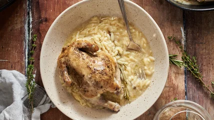 You'll also need salt, pepper, shallot, garlic, water, white wine, lemon juice, thyme, rosemary, and butter. We recommend using fresh herbs for a more herbal infusion of flavor, but you can also swap for dried herbs to more directly season the hens. The last thing you'll need is orzo, which can be found in the pasta aisle.