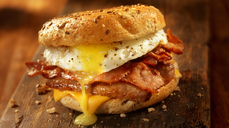 Most Starbucks breakfast sandwich fillings are stacked on a croissant or English muffin. But the brand's grilled cheese is sandwiched by hearty sourdough slices that provide a satisfying crunch while standing up well to their stretchy cheddar-and-Gruyère filling. Still, a little out-of-the-green-mermaid-paper-bag thinking can't hurt. For a hack that's extra enough to kick-start another great day, order the grilled cheese along with Starbucks' bacon and Gruyère egg bites and a portion of zingy sriracha (optional, but advisable).