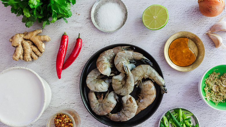 To make this basic Thai-inspired recipe, you will first and foremost need nice, plump shrimp. To build their flavor, we will need salt, black pepper, sweet paprika, and garlic cloves. For the rich coconut curry sauce, we will need butter, vegetable oil, a small onion, full-fat coconut milk, lemongrass, ginger, fish sauce, sugar, lime juice, chopped cilantro, chile flakes, scallion, and an optional small red chile, if you like things hot. These ingredients combine to give layers of flavor to the dish, from the succulent shrimp to the aromatic garlic and the rich creaminess of coconut milk, resulting in a satisfying and slurp-worthy broth.