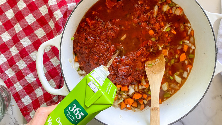 As with most soups, you're going to start by softening some of the core ingredients. In Italian cuisine, this typical mix of onion, carrots, and celery is called a soffritto. The French call it a mirepoix. Add the oil to a large soup pot and add the onion, garlic, carrots, celery, salt, and pepper. Sauté on medium heat for a few minutes. "Sautéeing this grouping provides a foundation of flavor to any soup, stew, or sauce," Hahn explains.