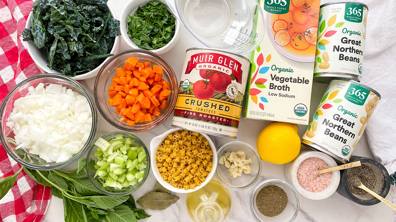 Then you'll need some pantry basics like olive oil, salt, pepper, fire-roasted tomatoes, vegetable broth, bay leaves, Italian seasoning, great northern or cannellini beans, and a small pasta like ditalini. "I like using fire-roasted tomatoes in most of my soups because of the added flavor but if you have standard diced tomatoes on hand you can sub in those," Hahn explains. For the pasta, any small pasta will be fine, even macaroni. Hahn also thinks it's important to use filtered water in this recipe.