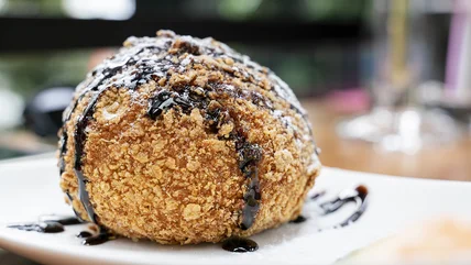 To replicate the tasting experience of fried ice cream without sizzling oil, directly roll balls of ice cream into your favorite cereal instead. The cereal should be finely smashed and ground to mimic the coating of the more traditional serving of fried ice cream. Not only is this oil-free method an easy way to reduce some stress — bashing bits of cereal in a plastic bag and pouring them into a bowl for your dessert has cathartic benefits — but the resulting recipe may become a go-to treat to serve at home. Quick and easy to assemble, your cereal-coated ice cream balls can be placed into the freezer to harden and removed when it's time to bring dessert to the table.