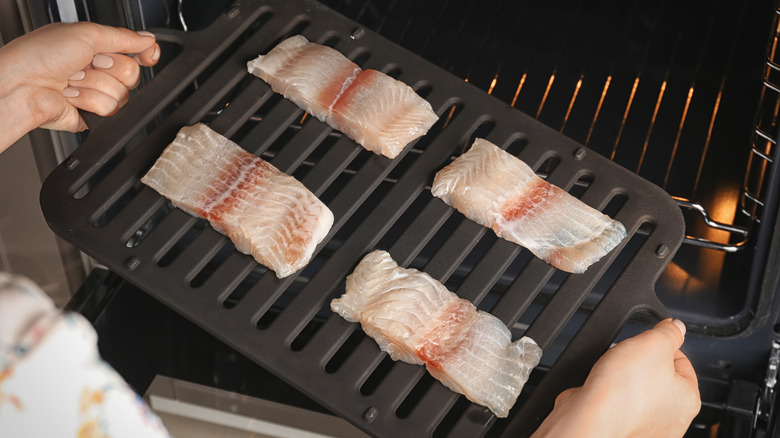 But what if the oven has no heat adjustments? That's when the oven racks become an advantage. A typical broiler will reach a high temperature of 500 degrees Fahrenheit, and the top rack of an oven rests three to five inches from the broiler. Thinner pieces of meat or fish can be placed here. Fish is almost always broiled this way, because the filets are so thin and don't take long to cook. Filets of salmon, tilapia, swordfish, or cod can be broiled quickly without being dried out or burnt.