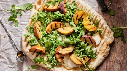 - While warm, top with arugula and grilled peaches, then drizzle with hot honey. Cut into 8–10 pieces and serve immediately.