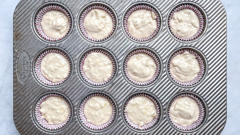 - Line a muffin pan with paper cups and fill each one ⅔ of the way up with cake batter.