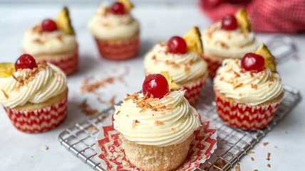 These cupcakes offer a delicious treat that's overflowing with the tropical flavors of being pineapple and coconut, just like a piña colada cocktail.