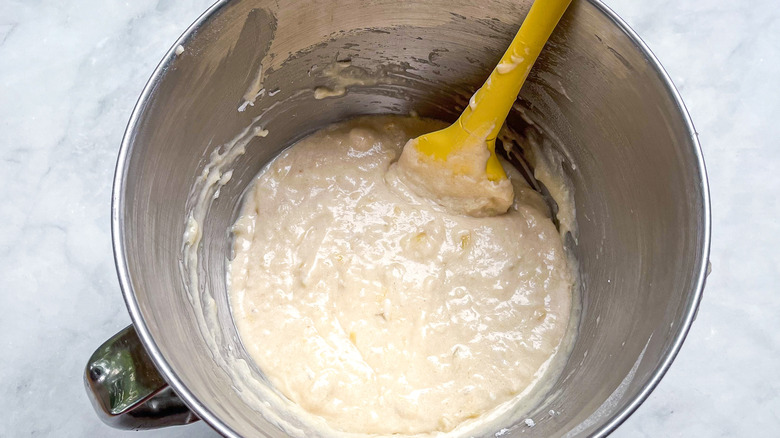 - Add the rest of the egg mixture, scraping down the bowl and beating until the mixture is well combined.