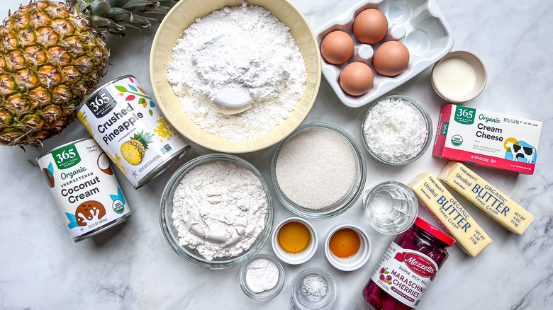 To make the cake batter, you're going to need quite a few ingredients. These include cake flour, sugar, baking powder, salt, eggs, cream of coconut, vanilla, coconut extract, rum extract or rum, butter, crushed pineapple, and sweetened flaked coconut. Some of these ingredients repeat in the frosting, but the additional items you'll need for this include cream cheese, powdered sugar, and heavy cream.