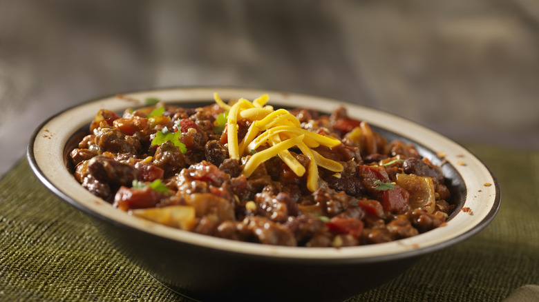 Whether you love a steaming pot of three-bean chili, or you'd rather stick to your meaty and rich no-bean chili recipe, we can all agree on one thing: It's all about the toppings. There's nothing like melted cheddar cheese, freshly chopped green onion, cool and creamy sour cream, and sweet and crunchy red onions adorning a steaming bowl of chewy chili. The beauty of a toppings bar is that you can feel free to experiment with unique ingredients, like potato chips.