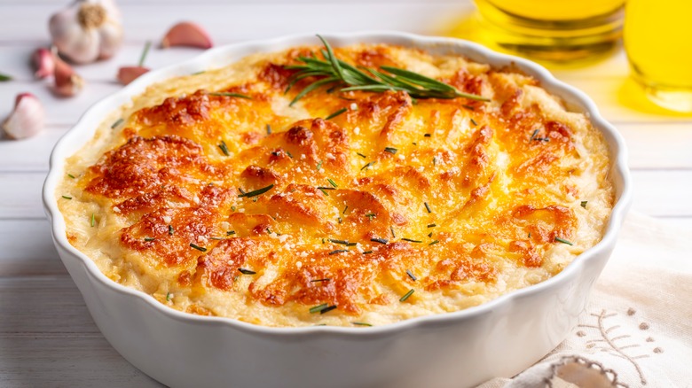 Instead of crushing them up as you'd do for most casserole recipes, lay the full potato chips to give your recipe a uniform and classic look. Choose potato chips that tend to be flatter, rather than kettle cooked. Who doesn't like a deep-fried snack-food addition to an already starchy and cheesy indulgent recipe? It makes the perfect contrast. Alternatively, you can layer the potato chips right into the uncooked potatoes for a thinner, saline layer of tuber texture variation. The chips almost read as cheese-like and can make for a deluxe mouthfeel.