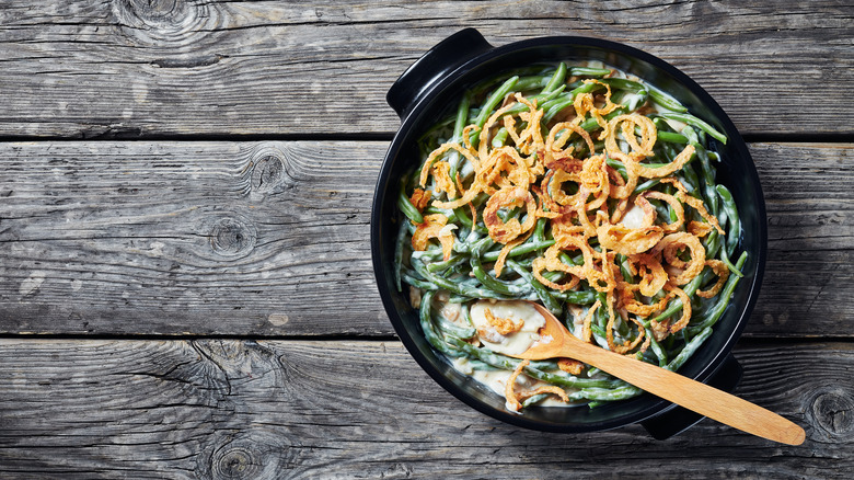 Green bean casseroles are a potluck classic. In fact, it's hard to find a dinner party, especially in the Midwest, where the famous vegetable side dish isn't featured. Nobody is complaining here! The combination of creamy mushroom soup and tender green beans is timeless when baked to perfection and topped with onion strings. If you're short on a container of French's fried onions, why not switch up your green bean casserole game and try a new topping? Swap in potato chips.