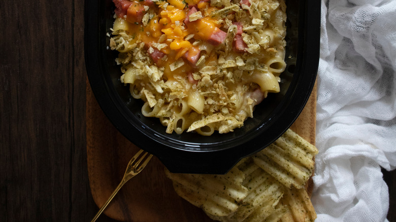 The salty and oily components of the potato chips mimic those in the dish itself. However, while mac and cheese are notorious for being silky smooth, potato chips offer a welcome crunch to the top. This is why mac and cheese casseroles are often loaded with buttered bread crumbs, but we think potato chips do it best, especially since there are so many flavors to choose from.