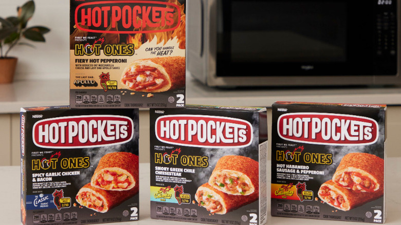 As reported by Mashed, which got an exclusive first taste of the spicy snacks, the Hot Pocket's "Hot Ones" lineup will feature four new flavors, which Hot Pockets calls "the hottest Hot Pocket ever!" The four flavors are based on "Hot Ones'" partnership with Heatonist and are headlined by the Fiery Hot Pepperoni featuring "Hot Ones" The Last Dab: Apollo, an Apollo-Pepper-based version of the famous fiery hot sauce from the show. While the other flavors are slightly less intimidating, they are still pretty spicy, with a habanero-pepperoni and sausage flavored with red jalapeños and habanero chiles as the next hottest. There will also be Smoky Green Chile Cheesesteak with "Hot Ones'" Los Calientes Verde and a Spicy Garlic Chicken & Bacon with "Hot Ones'" fresno chile and garlic sweet heat sauce. Hot Pockets is promising a special appearance on "Hot Ones" in October.
