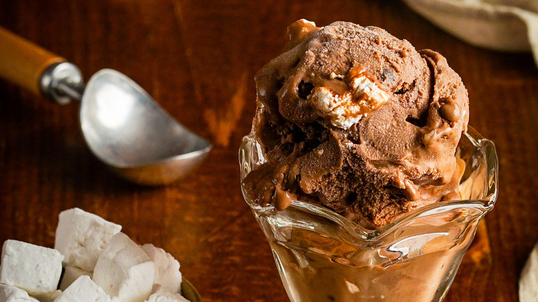 When following a specific diet, like being a vegetarianism, there's a lot to think about when it comes to ingredients. Meat byproducts frequently make their way into unexpected foods. Case in point: Some popular brands of rocky road ice cream — ostensibly made up of chocolate ice cream, crunchy almonds, and marshmallows — don't adhere to vegetarian guidelines. So, what ingredient makes this classic ice cream flavor not so vegetarian friendly? It's all in the gelatin.