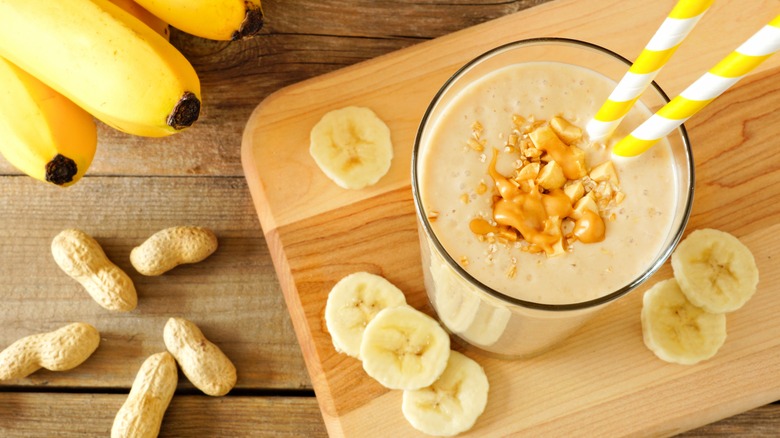 If you're the type of person to enjoy how banana overtakes everything in a smoothie, stick with peanut butter. A classic through and through, the earthy, salty taste of peanut butter can take on banana's mildly sweet, yet somehow bold flavor. Above all, peanut butter is creamy, adding a smooth texture to already soft bananas. If you're still craving that sugary taste, add some strawberries to your banana and peanut butter smoothie.