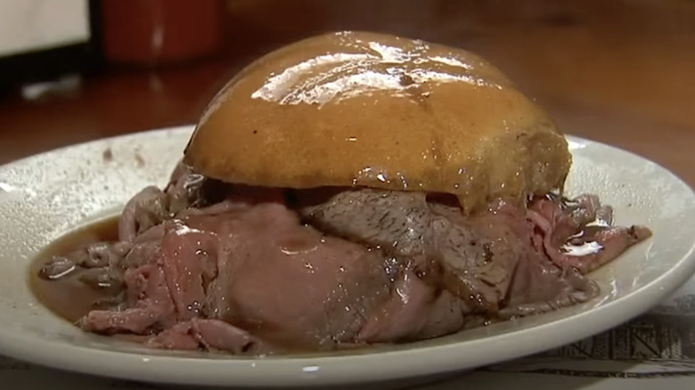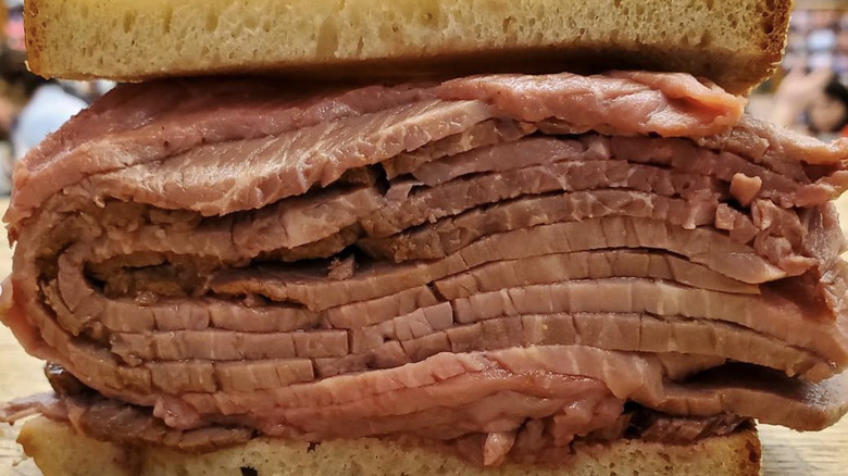 Katz's is known for its pastrami, matzoh ball soup, and for being the backdrop of Meg Ryan's iconic scene in "When Harry Met Sally" where she fully displayed her acting talent. The fandom may have taken off thanks to the frequent famous patrons, but the real star power is on the menu. One Katz order that's often overlooked is the roast beef. Unlike most of the other sandwiches on this list, Katz cuts its roast beef thick, rather than thin. There's the traditional sandwich option, tossed right on some untoasted bread, or the hot open-faced route. Neither will disappoint, because it's all about that beef.