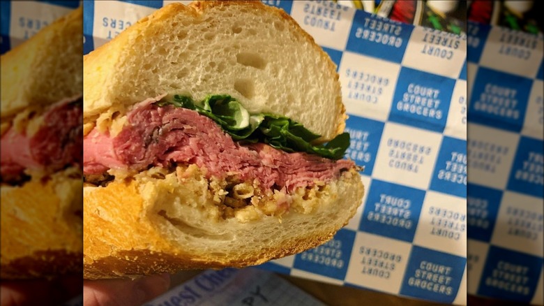 There's just something about a perfect roast beef sandwich. Maybe it's the bold flavors of slow-roasted beef, the fluffy rolls with a hint of sweetness, or just the nostalgia of a good, messy sandwich. When it comes to roast beef, much like any sandwich, there are different approaches. We have the old standbys that center around gravy, Italian-influenced sandwiches with fresh mozzarella, and even kosher, squished between two pieces of hearty rye.