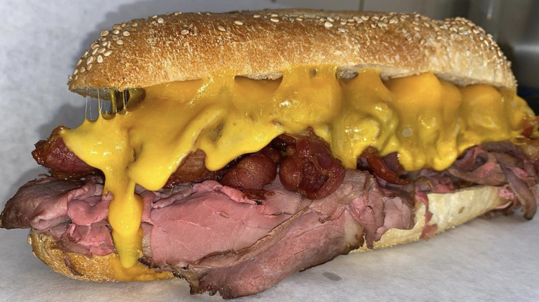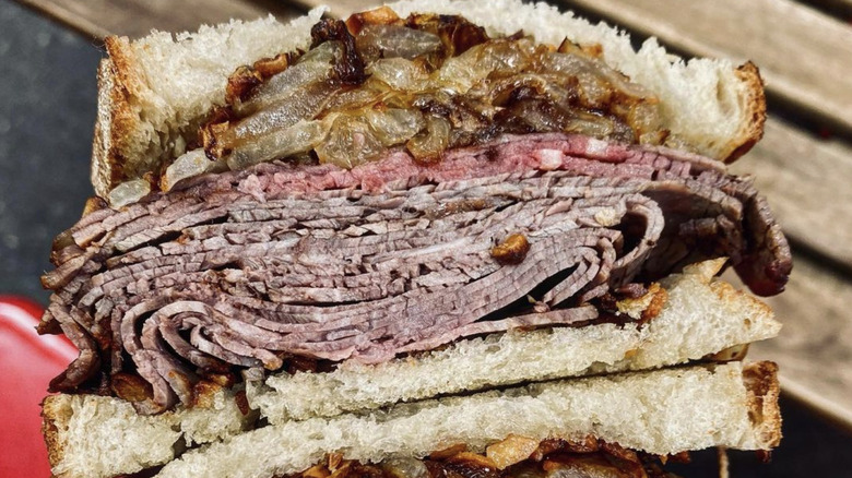 As an NYC institution, it's only expected that this roast beef sandwich makes the list. He may have gravitated towards the pastrami on rye, which in his eyes was a "quintessential New York meal," but the late Anthony Bourdain praised Pastrami Queen as the best of the best. The hardworking crew behind the scenes cooks everything fresh daily, and it shows with each bite. The Pastrami Queen menu offers customization, but the "royal size" roast beef is the way to go. It's smothered in grilled onions and served on garlic bread, with plenty of Russian dressing and coleslaw on the side.