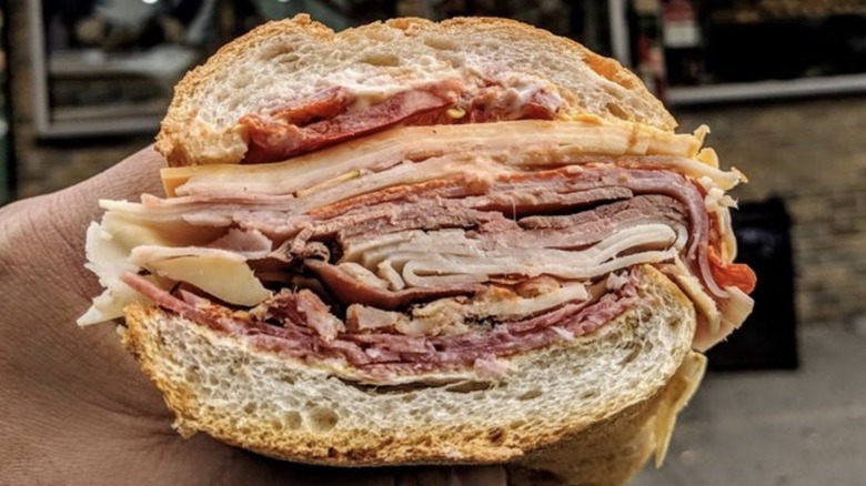 The deli's menu is separated by meats, naturally, and its signature roast beef sandwich is the Johnny Roast Beef which is smothered in gravy, caramelized onions, and mozzarella cheese. The staff is clearly fans of mafia-themed entertainment, with the other two roast beef sandwiches named after "The Sopranos" and "Goodfellas" characters. The Tony Soprano is a super classic option simply with roast beef, lettuce, tomato, and mayonnaise, whereas the Paul "Paulie" Cicero is topped with crispy bacon, lettuce, tomato, gooey American cheese, and Russian dressing. All delicious options, but the standout has got to be the simple classic. The gravy-drenched sandwiches are laid out on a paper plate, even when wrapped in tin foil to go, leaving proof of just how much gravy we're talking about here.