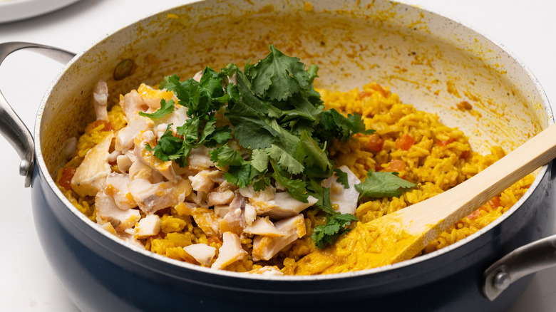 - Once the rice is tender, remove the pan from the heat and stir in the flaked smoked haddock, eggs, and cilantro. Serve hot.