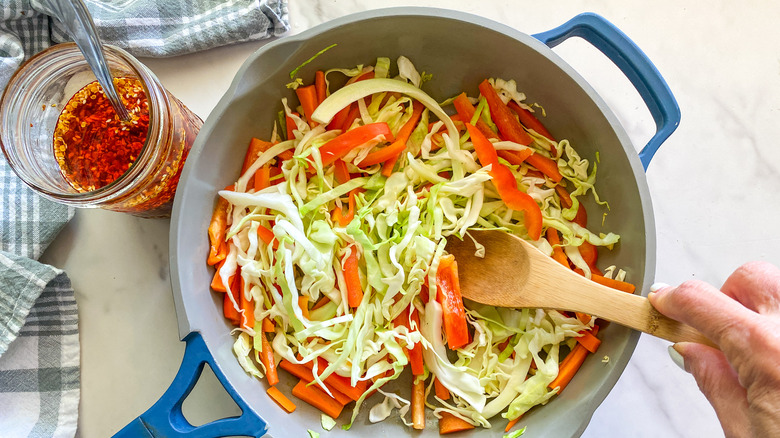 - Heat up the remaining oil in a frying pan and add the cabbage, red pepper, and carrot. Sauté for 10 minutes on medium heat.