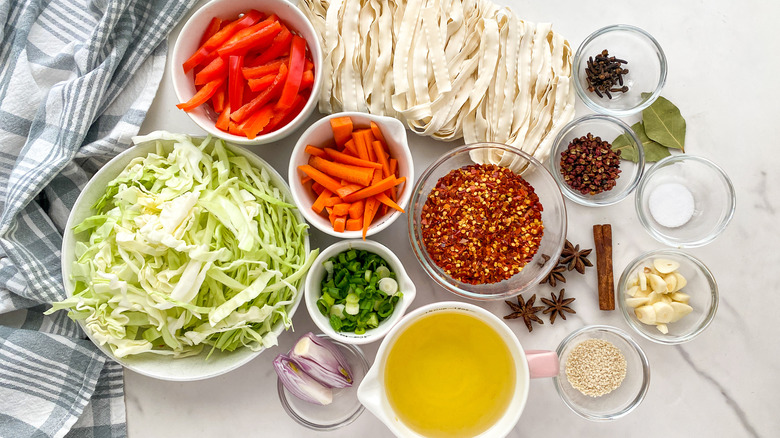 From the produce aisle, you'll need garlic, shallot, cabbage, red pepper, a carrot, and scallions. Some spices, sesame seeds, and oil finish off the list. Since you'll be cooking at high heat, grab some avocado oil, which has a high smoke point. The spices needed are star anise, bay leaves, whole cloves, a cinnamon stick, and salt. For the sesame seeds, you can use raw or roasted.