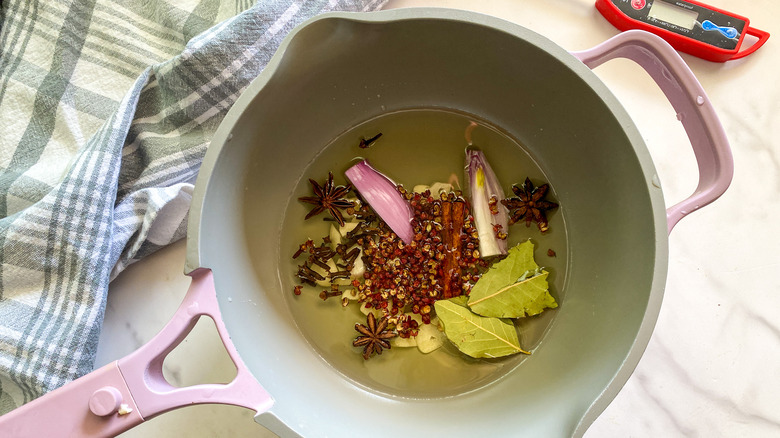 To start, you'll need to infuse the aromatics and spices into the oil. Grab a medium pot and pour in the oil. Then add the peppercorns, star anise, bay leaves, cloves, cinnamon stick, garlic, and shallots. Bring the heat to medium and test it with a food thermometer until it reaches the desired temperature between 225-250 F. "The spices can easily burn while they are in the oil, so it's important to monitor the temperature," Hahn explains.