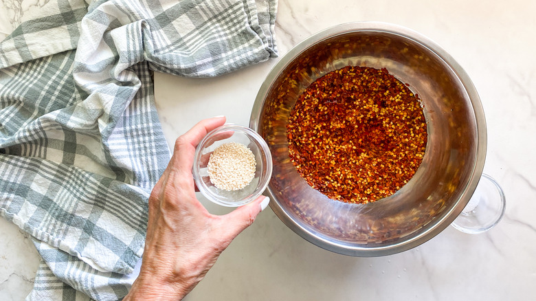 - Pour the hot oil over the chile flakes. Stir well then add the salt and sesame seeds and set aside.