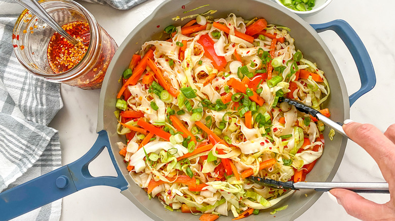 To start this step, begin cooking the noodles according to the package directions. While they're cooking, add the remaining oil to a large frying pan and add the cabbage, red pepper, and carrots. Bring the heat to medium and cook the vegetables for about 10 minutes stirring frequently. "The veggies will cook quickly because we want them bright in color and still crunchy," Hahn explains.