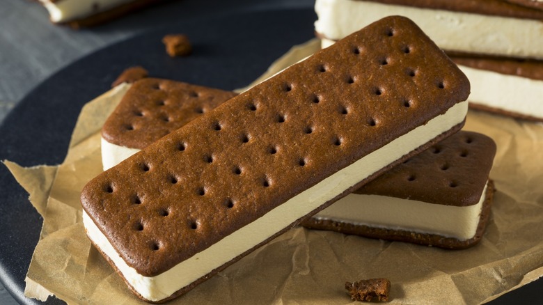 Classic ice cream sandwiches are the stuff childhood memories are made of. Though this warm-weather dessert has a long and rich history (the version we're most familiar with has been around since 1945), its popularity still endures to this day. If you ever desired to revisit this frozen treat as an adult, you may have considered making it home. Of course, the ice cream's the easy part. No problem there. It's the chocolatey outer layer — the texture of which is a cake-like cookie — that stumps many.