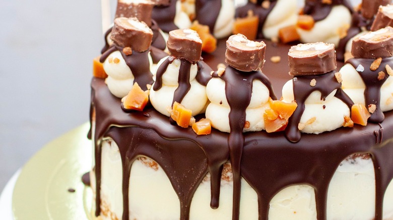 While Twix are delicious, they are not the only chocolaty treat that works for this dessert. Kit Kats would be great here, and they would achieve a similar result. You could also mix and match chocolate candies, using one for the sides of the cake and something different for the top. M&Ms would add some fun colors to the cake, for instance. And if you wanted to bring in a complimentary flavor, decorate the top with Reese's Pieces. With this dessert, the options are endless.