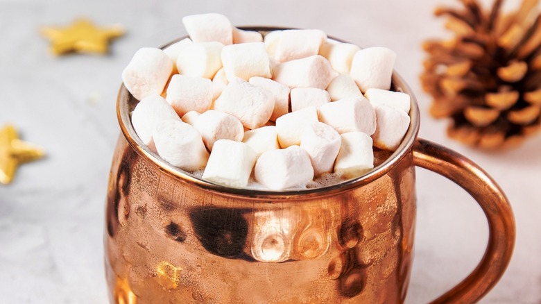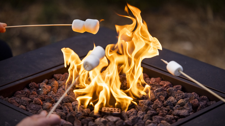 If you do happen to be camping in the great outdoors, it should be easy enough to get a toasty garnish — just roast your marshmallows over the fire along with your s'mores. You could also replicate the effect with a fireplace if you have one. Without a fire, however, you can blast your marshmallows with a blow torch or hold them on a stick over a gas stove. This garnish is optional, of course, but essential if you're dedicated to channeling the campfire vibes. As an alternative, you could use a combination of marshmallow-flavored vodka and crème brûlée liqueur — the latter of which has vanilla, caramel, and brown sugar flavors — instead of whiskey or bourbon.