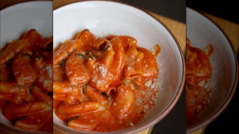 Ospi's spicy rigatoni alla vodka is a hearty portion that boasts a beautiful red color, al dente noodles, and a cheesy crumble on top. Enjoy it as your entree or share it with the table and order a variety of other bites.