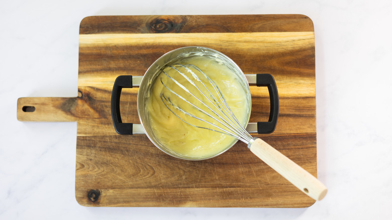 - Pour the mixture back into the saucepan and cook over low heat, whisking constantly, until the mixture thickens and comes to a gentle boil. Once thick, immediately remove from heat and pour into a mixing bowl.