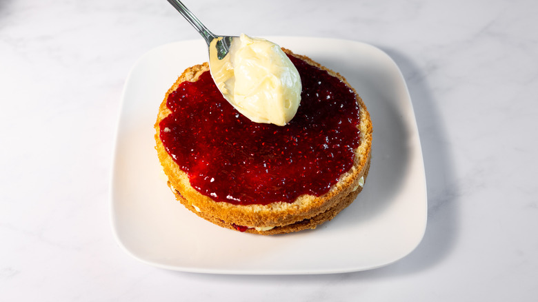 - Place the second cake layer on top of the pastry cream, then spread the remaining raspberry jam and crème pâtissière over the top.