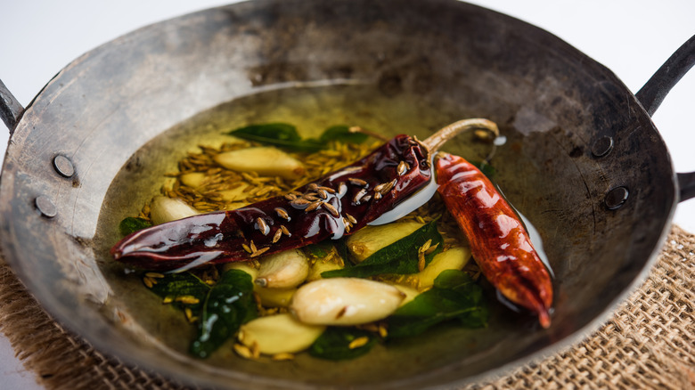 Tempering, referred to as "tadka" or "tarka" in Hindi, is an Indian cooking method that imparts new layers of flavor to your culinary creations. It involves heating oil in a small pan, spluttering spices and aromatics, and pouring the mixture over cooked curries, lentils, and rice dishes. The ingredients you use are up to your discretion: Garlic, dried chilis, mustard seeds, cumin seeds, coriander seeds, and even split lentils are customary choices.