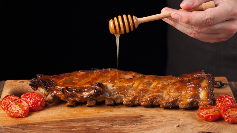 Garten confesses there are "a lot" of ingredients required to make this sauce, but it's worth it. In an episode of "Barefoot Contessa," via YouTube, she shares that it all starts with chopped onion and garlic sautéed in vegetable oil, along with a little tomato paste and cider vinegar. Then comes the cup of golden honey which the cookbook author shares will caramelize on the grill and this is where the depth of flavor this ingredient adds really pays off.