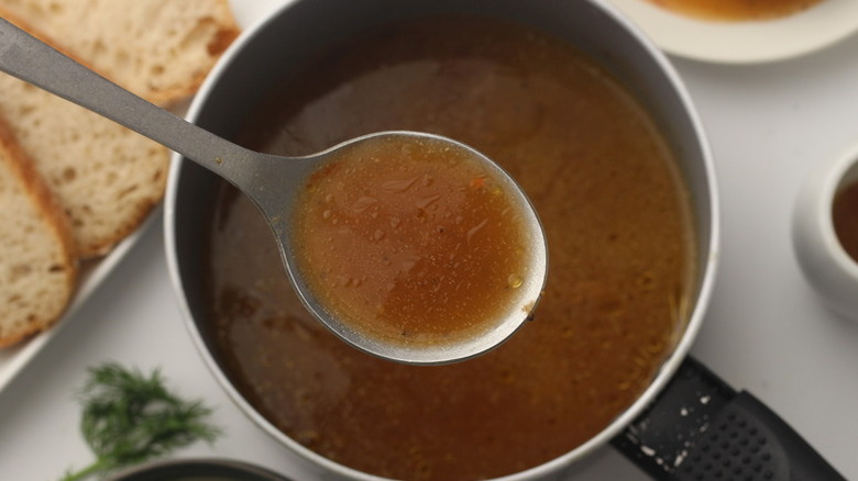 Au jus is so much more than just beef broth. Translated from French, "aus jus" literally means "with the juice" in English, and indeed, the aptly-named sauce is generally created by combining beef drippings (juice) with butter, wine, and a couple of other dealers' choice ingredients. It's perhaps best known as the go-to accompaniment for a French dip, but rich au jus has so much more to offer.