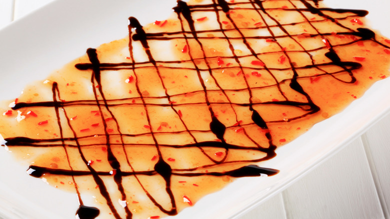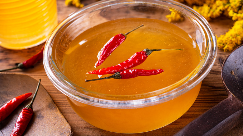 Hot honey hasn't always enjoyed the limelight, but as America's penchant for sweet and spicy foods has exploded, adding hot honey to dishes as diverse as sweet tea, cornbread, and pepperoni pizza is now in vogue. The recipe for hot honey can be as simple as allowing hot peppers to sit in warmed honey for a few days — that's all it takes for the sweet, syrupy honey to become infused with the smoky spice of the peppers.