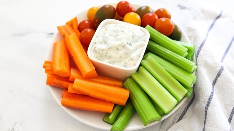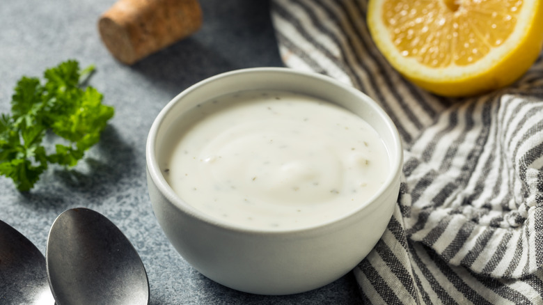 Let's kick things off with the most traditional cheese curd dipping sauce. Made from a creamy base (buttermilk is most common), herbaceous spices like thyme, dill, or parsley, onion or garlic, and black pepper, ranch has been one of the most popular dressings in America since its invention in the 1950s. Its cooling, creamy properties make it a popular choice for cooling down spicy foods like hot wings, but honestly, people will pair it with just about any savory bite imaginable.