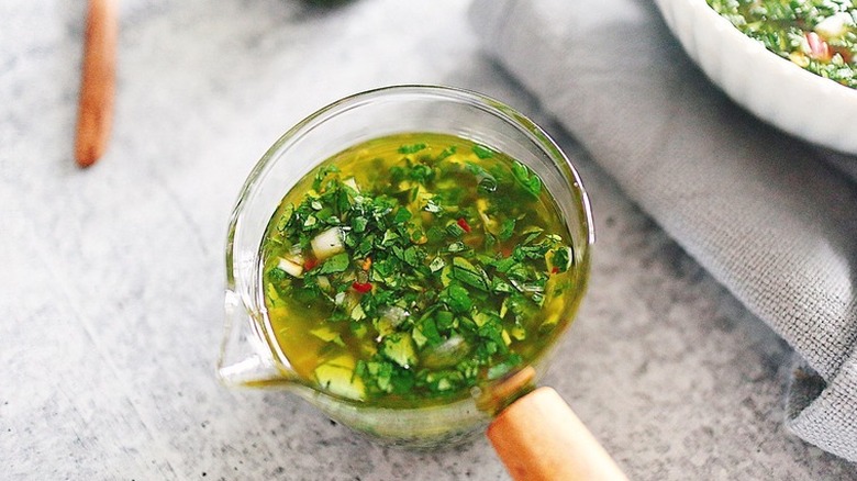 Chimichurri is South America's answer to basil pesto. The bright, herbaceous sauce is traditionally made with parsley as the primary herb in the mix, but fresh chimichurri sauce can be made using just about any herbs taking up space in your produce drawer — cilantro, green onions, and oregano would all make tasty additions. Other ingredients in parsley-based chimichurri commonly include onions, garlic, a bit of vinegar for tang, olive oil, additional garden herbs, and salt and pepper.