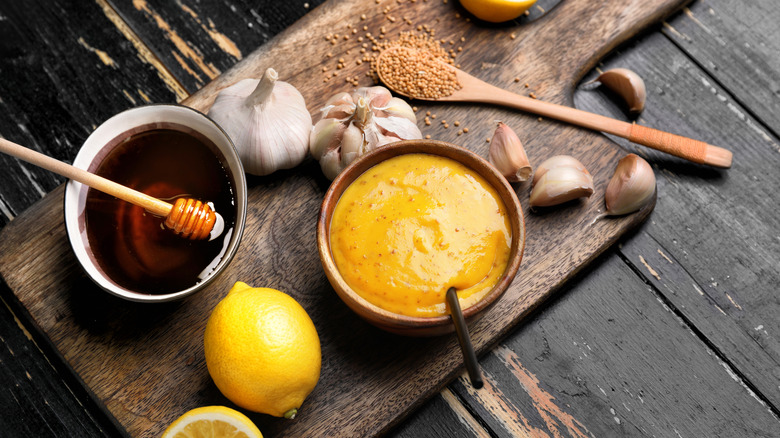 Honey mustard's potential ranges far beyond dinner salads and McDonald's chicken nuggets. The sweet and funkily spicy sauce is typically made by combining honey and mustard (shocker, we know) with vinegar, spices, and occasionally lemon or lime juice for additional acidity. A variety of mustards can be used — French, Dijon, stone-ground, yellow, and more — so different dressings will have varying flavors depending on the mustard incorporated. However, for the most part, honey mustard has a sharp, almost horseradish-like spice tempered by the sweetness of honey and a vinegary tang.
