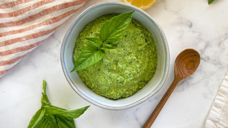 Fresh herbs are one of the best ways to counterbalance salty, fatty foods, and bright, fresh pesto — a sauce made from basil, pine nuts, Parmesan cheese, olive oil, garlic, and lemon juice — delivers a soothing, herbal coolness to everything it touches. As a bonus, the best basil pesto has a bright green hue, which looks pretty cool when contrasted with the crispy golden skin of piping-hot fried cheese curds.
