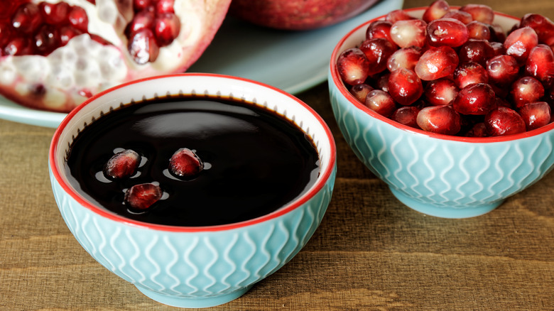 Pomegranate molasses, made by extracting the juice of brilliant garnet pomegranate arils and allowing the juice to simmer until it's reduced by about 75%, has little in common with traditional molasses aside from consistency. Pomegranate molasses is rich and slightly sweet, but being derived primarily from the juice of pomegranate seeds, its overwhelming flavor is more tart and tangy with a hint of musk and sometimes citrus.