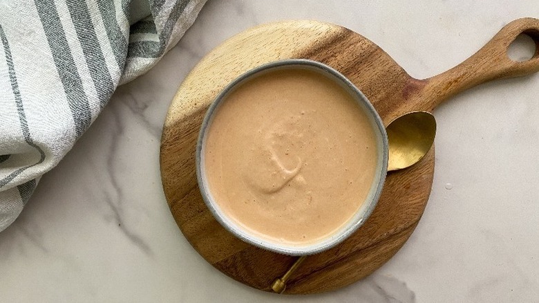 A salad dressing aisle staple, Russian dressing is great for sandwiches and salads, but it's also a fantastic addition to cheese curds. The creamy base provides a refreshing break from the crispy, piping-hot curds, and the other ingredients blend together to offer plenty of vinegar and spice. It's a catch-all condiment and a great way to elevate your cheese curds.