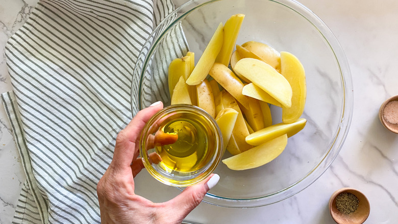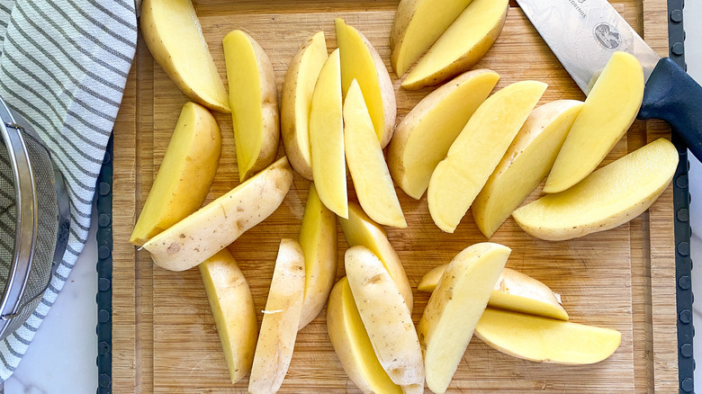 The first step is to cut the potatoes into wedges. "I do this by cutting each potato in half lengthwise, then place the half cut side down, and slice it at an angle to create 3 wedges from each half," Hahn explains. "There is no need to peel the potato as the skin is full of vitamins and they taste great this way," Hahn goes on to say.