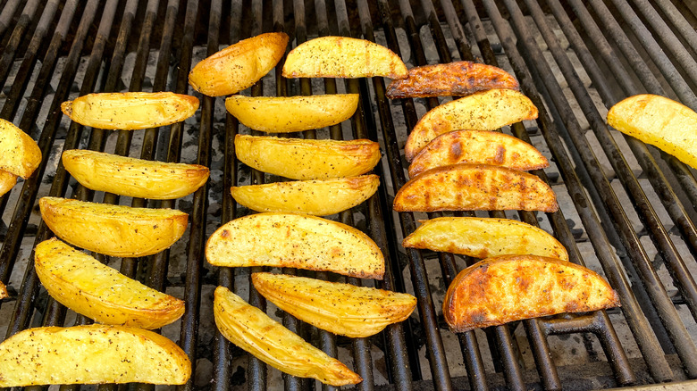 - Place the potatoes directly on the grill grates and cook for 10 minutes on each side.