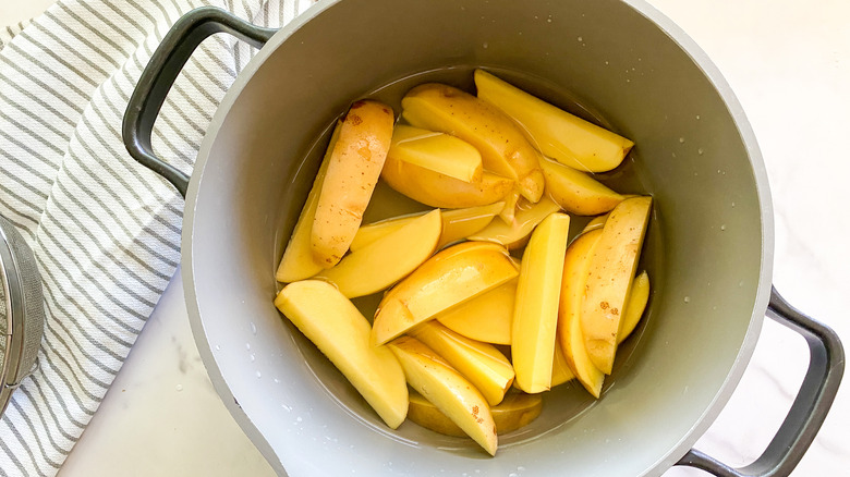 To cut some of your grill cooking time and infuse the vinegar taste into the potatoes, you're going to pre-cook them. Pull out a medium pot and add the vinegar and the potato wedges. Bring the mixture to a boil, then reduce the heat to medium and cook for about 10 minutes. "This timing is based on the size of your wedges, so it may vary a bit. You're looking for the potatoes to be slightly tender, but not fully cooked," Hahn says.