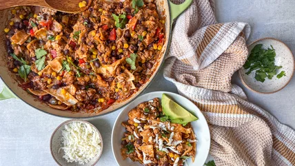 Finish off the skillet casserole with tortillas and cheese