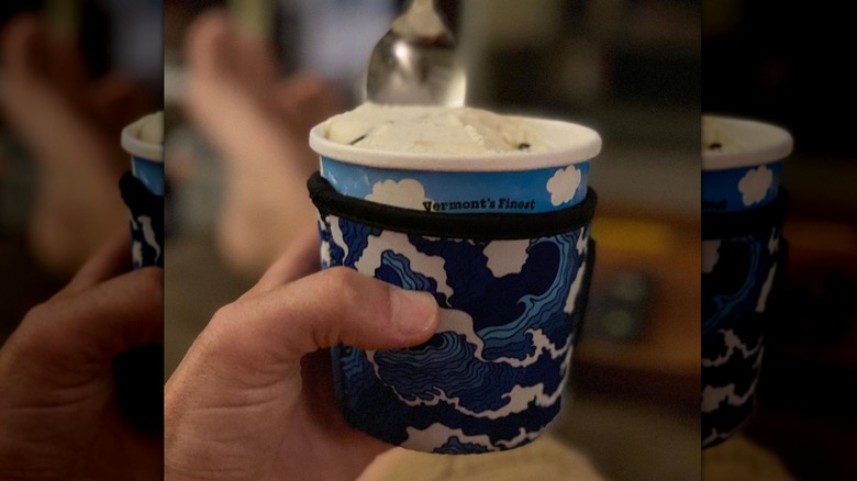 Although using a pre-frozen ice cream bowl is a simple hack to prevent ice cream from melting too fast, it does require a bit of planning ahead — you want to have the bowl in the freezer for at least an hour, and ideally for four hours, to get it cold enough to make a difference. Plus, there's something just downright delightful and decadent about eating ice cream straight out of the pint, even if your hands get cold while holding the pint, and the ice cream seems to melt even faster when you're holding the pint. Luckily, you probably already have something at home that you can use to keep your ice cream pint from melting: a koozie. It works great for keeping your beer cold, and will work just as well to keep your ice cream cold.